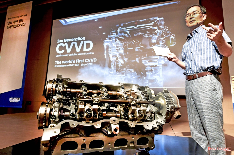 이날 엔진 신기술 설명을 맡은 현대차 하경표 연구위원은 "CVVD는 엔진 밸브를 열고 싶을 때 열고, 닫고 싶을 때 닫을 수 있는 기구를 고안하자는 아이디어에서 시작했다"며 "많은 제조사들이 가변 밸브 제어 기술을 개발하고 있지만 CVVD를 쉽게 구현하진 못했다. 이번에 현대차는 엔진 밸브 열림 시간 제어를 획기적으로 늘려주는 기술을 세계 최초로 개발, 엔진의 성능과 연비를 동시에 향상시켰다"고 말했다.