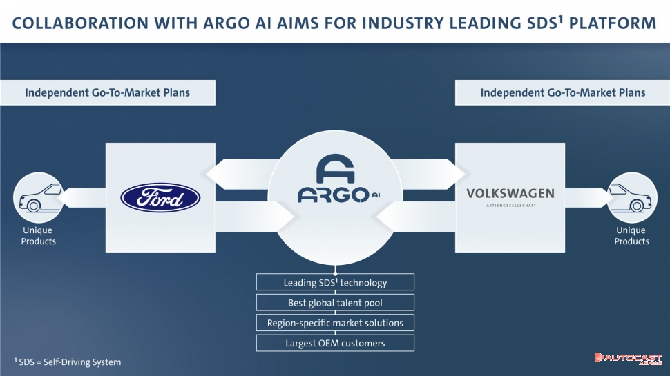 폭스바겐은 앞으로 3년간 포드로부터 아르고 AI 지분 5억 달러를 인수해 자율주행 기술업체에서 동등한 파트너가 된다. 이번 거래로 아르고 AI의 가치는 70억 달러로 높아지게 됐다. 아르고 AI는 현재 4등급 자율주행 시스템 개발에 한창이다.