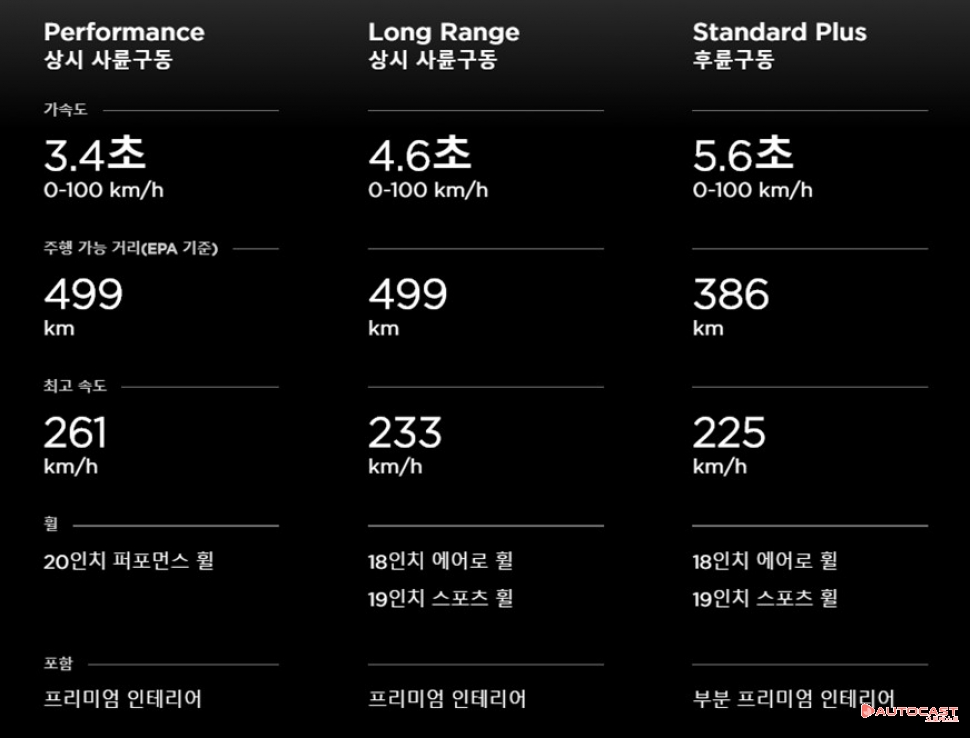 다만 많은 소비자들이 주목하는 것은 수치로 표현하는 성능이다. 특히, 정지상태에서 시속 100km/h에 이르는 소위 ‘제로백’이 인상적이다. 뒷바퀴 굴림 방식의 기본 모델 ‘스탠다드 플러스’가 5.6초다. 2017년 기아자동차의 스팅어 3.3 트윈 터보가 제로백 5.1초로 등장하면서 5000만원대 고성능 자동차라고 불린 것과 비교하면 인상적이다. 테슬라 모델3의 상시 사륜구동 모델 ‘롱 레인지’는 제로백 4.6초. 상시 사륜구동 모델의 ‘퍼포먼스’는 무려 제로백 3.4초다. 사실상 지금까지 제로백 3초대의 자동차는 슈퍼카 혹은 하이퍼카의 영역이었다. 페라리, 마세라티, 포르쉐의 고성능 모델에서 가능한 수치였지만 테슬라 모델3로 경험할 수 있다.