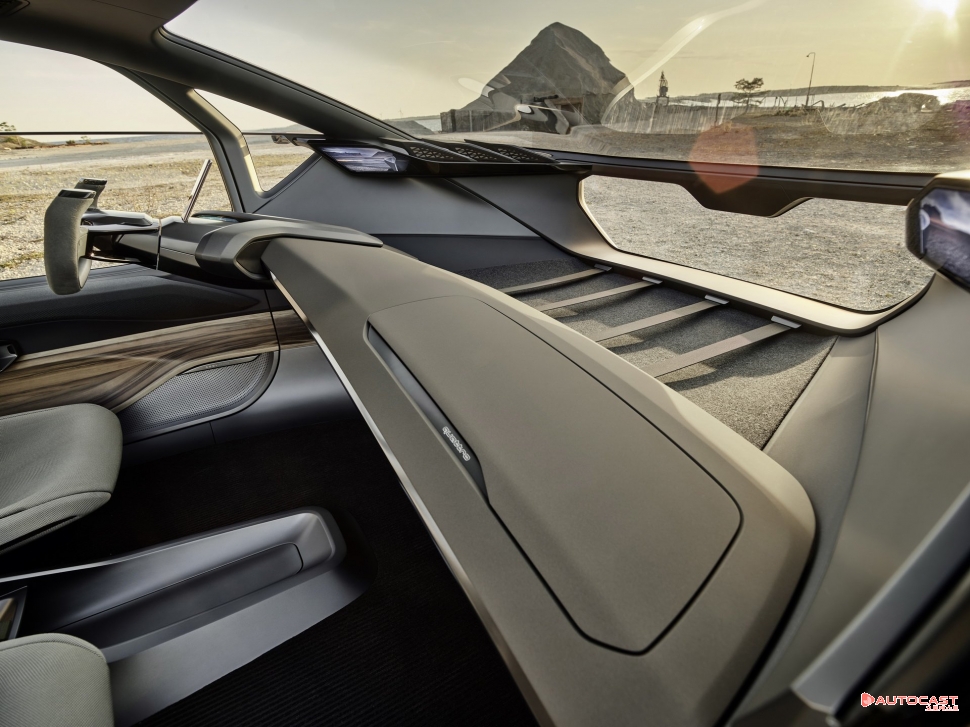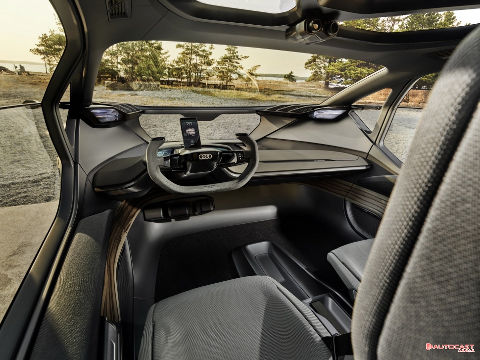 대시보드에는 자체 디스플레이가 없다. 대신 운전자의 스마트폰을 사용하는데, 이 스마트폰은 차량의 기능과 내비게이션 시스템의 디스플레이와 제어 센터로 스티어링 칼럼에 부착되어 있다. AI 내부에 스크린을 담지 않겠다는 의지가 반영된 것이다. 아우디는 트레일을 이용해 더 낮은 대시보드를 만들 수 있었다.