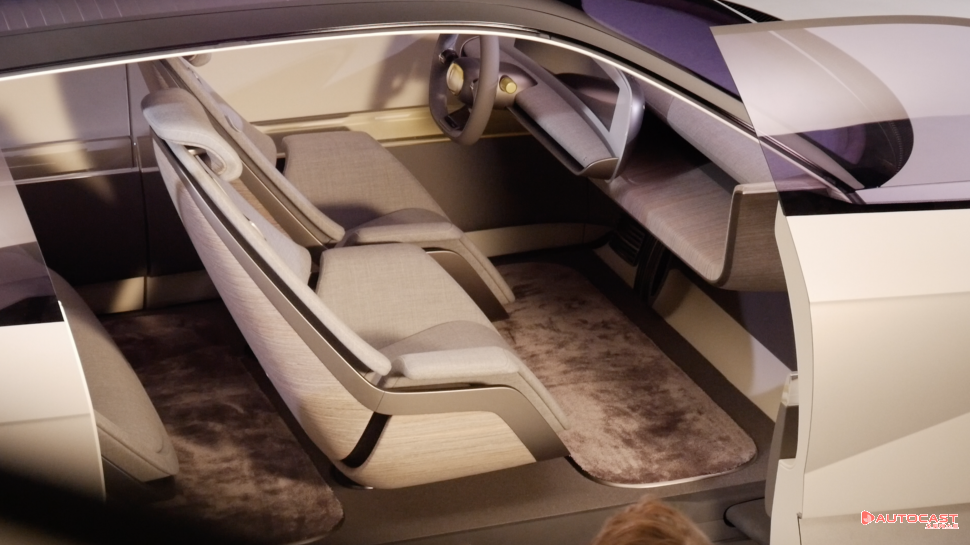 실내는 거실에 가구를 놓은 듯 아늑한 생활 공간으로 디자인했다. 바닥면에 배터리팩을 장착한 덕분에 내연기관 자동차와 다르게 실내 바닥이 평평하다. 카페트를 사용해 소음을 최소화했다. 아울러 나무와 패브릭, 가죽 소재를 크래쉬패드, 도어, 시트 등에 적극적으로 활용해 집과 같은 따뜻하고 편안한 느낌을 구현했다.