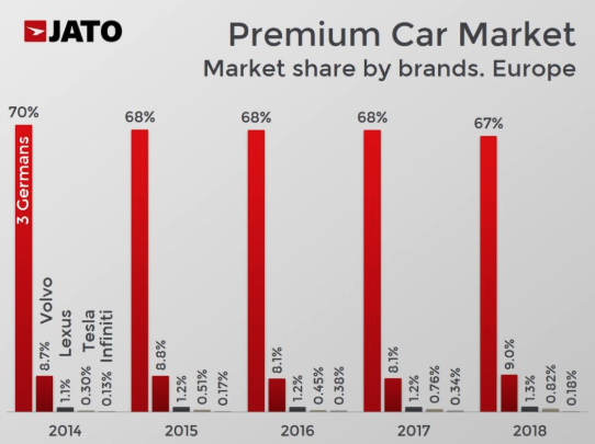 토요타 렉서스는 20년째 유럽 시장에서 판매 중이지만 판매 점유율은 여전히 저조하다. 지난해 렉서스는 유럽에서 총 4만6203대를 판매, 전체의 1.5%를 차지했다. 유럽 브랜드라도 예외는 아니다. 지난해 랜드로버는 4.9%, 재규어는 2.7%의 판매 점유율을 나타냈다. 마세라티, 알파로메오, PSA그룹의 DS 역시 판매가 낮다.
