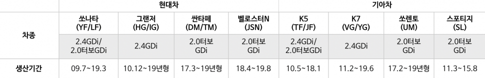 대상 차량은 구체적으로 쎄타2GDi, 쎄타2 터보 GDi 엔진이 장착된 2010~2019년형 현대차 쏘나타(YF/LF), 그랜저(HG/IG), 싼타페(DM/TM), 벨로스터N(JSN), 기아차 K5(TF/JF), K7(VG/YG), 쏘렌토(UM), 스포티지(SL) 총 52만대다.