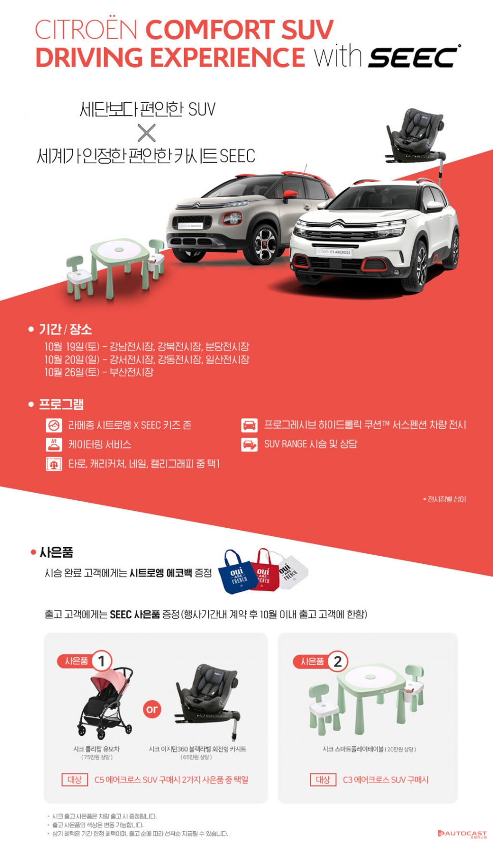 [오토캐스트=정영철 기자] 시트로엥 코리아가 10월 주말 동안 모든 SUV 라인업을 시승할 수 있는 ‘시트로엥 컴포트 SUV 시승행사’를 진행한다고 15일 밝혔다. 이번 시승행사는 오는 19일 강남∙강북∙분당 전시장, 20일 강서∙강동∙일산 전시장, 26일 부산 전시장에서 진행한다. 행사 관계자는 “케이터링과 함께 각종 문화 행사와 키즈존을 마련해 가족이 함께 즐길 수 있는 행사로 진행할 계획”이라고 말했다. 이번 행사는 편안함, 안전, 실용성의 가치를 내세우는 토탈 베이비케어 브랜드 시크(SEEC)와의 협업으로 진행된다. 시크의 카시트 및 유모차 전시와 함께 공동 프로모션도 마련했다. 현재 시트로엥 SUV는 C5 에어크로스 SUV, C4 칵투스, C3 에어크로스 SUV 총 3가지 라인업을 가지고 있다.시트로엥 관계자는 “ SUV는 가족단위 고객에게 인기 차종으로 꼽히고 있다. 이번 행사를 통해 시트로엥 SUV의 매력을 넓은 고객층에게 알리고 더 나아가 시트로엥 브랜드를 어필할 수 있길 기대한다”고 밝혔다.cdyc37@autocast.kr