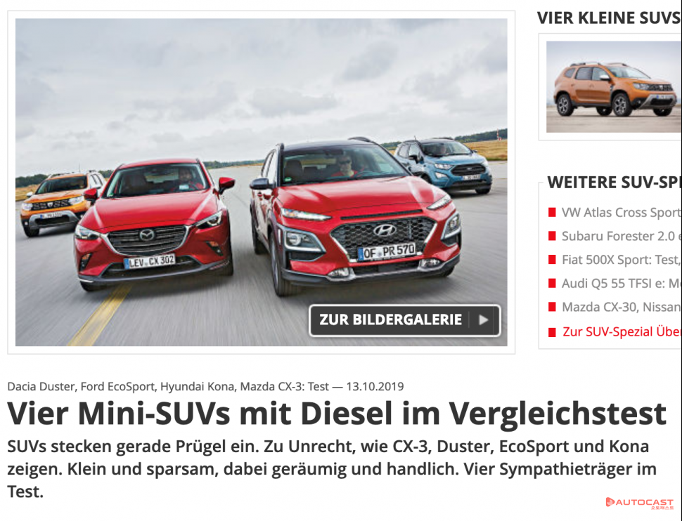 이번 평가는 유럽에서 판매 중인 소형 디젤 SUV를 대상으로 진행됐다. 코나, 마쯔다 ‘CX-3’, 포드 ‘에코스포트(EcoSport)’, 다치아 ‘더스터(Duster)’는 ▲차체(Body) ▲파워트레인(Powertrain) ▲주행 성능(Driving Dinamic) ▲주행 안락함(Driving Comport) ▲차량 연결성(Connected Car) ▲친환경(Environment) ▲비용(Cost) 등 7개 부문에 걸쳐 비교 테스트를 거쳤다.