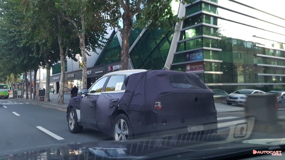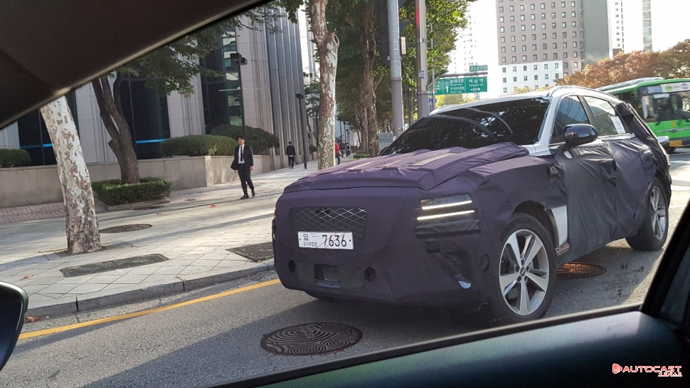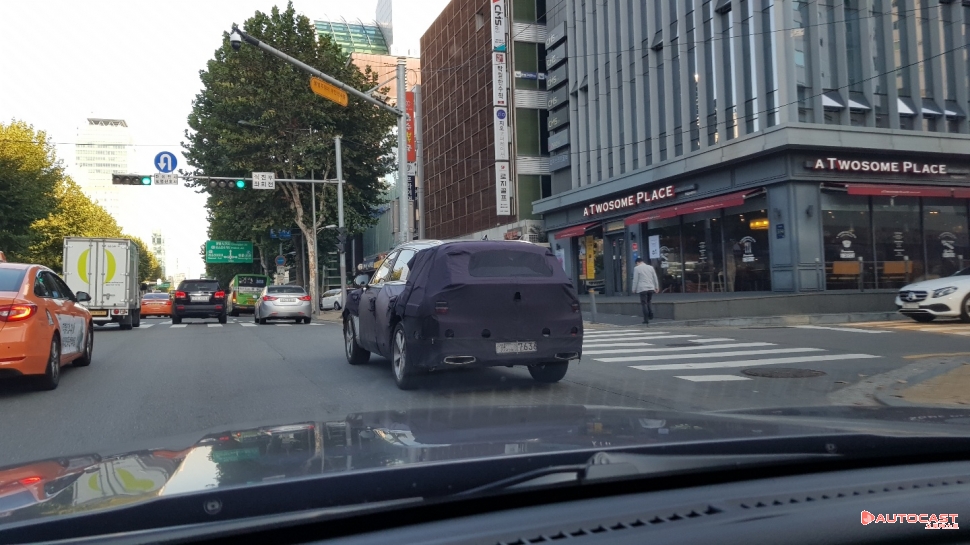 앞모습을 보면 두 줄의 DRL이 헤드라이트에 들어온 모습이 제네시스의 피를 인증했다. 또, 라디에이터 그릴 역시 기존 제네시스의 디자인과 맥을 같이한다. 번호판 아래로는 주행보조시스템을 위한 센서가 들어갔다. 좌우에 뚫린 구멍에도 센서가 들어간 것으로 보인다. 이날 목격한 모습에는 A, B 필러와 루프라인이 훤하게 드러났다.