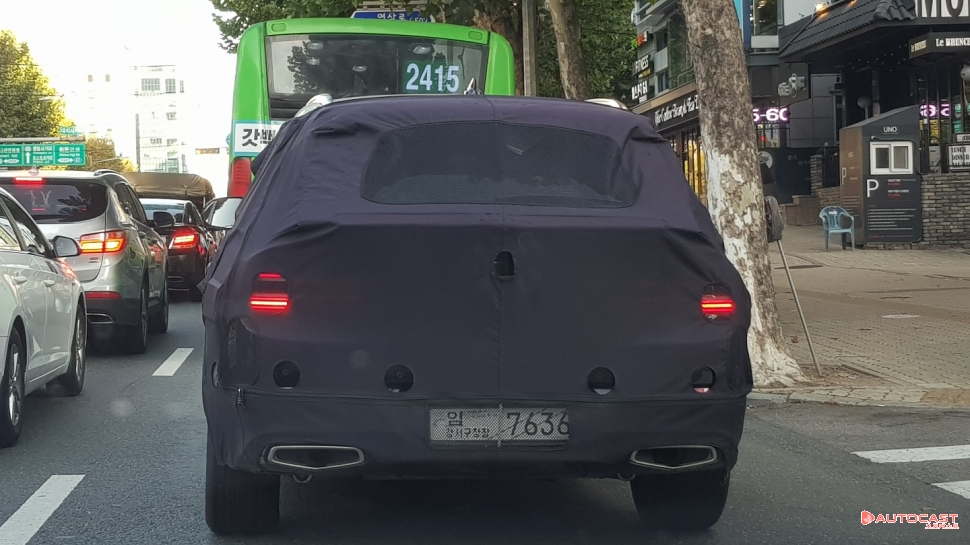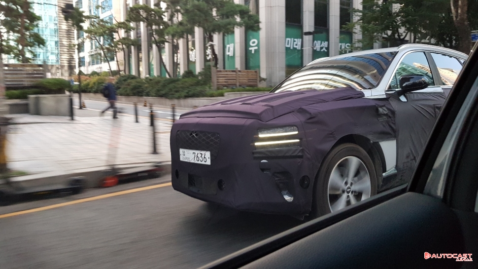 [오토캐스트=이다일 기자] 다음 달 출시를 앞둔 제네시스의 SUV GV80이 점차 위장막을 벗고 있다. 25일 오전 서울 시내에서 목격한 모습은 차체에 얼룩무늬 패턴이 사라지고 주요 부분의 두터운 위장막만 장착하고 도로를 달렸다. 앞, 뒤의 뚜렷한 라이트 디자인과 라디에이터그릴 모습으로 제네시스 GV80임을 한 눈에 확인할 수 있다.