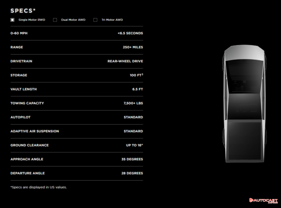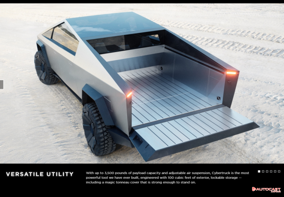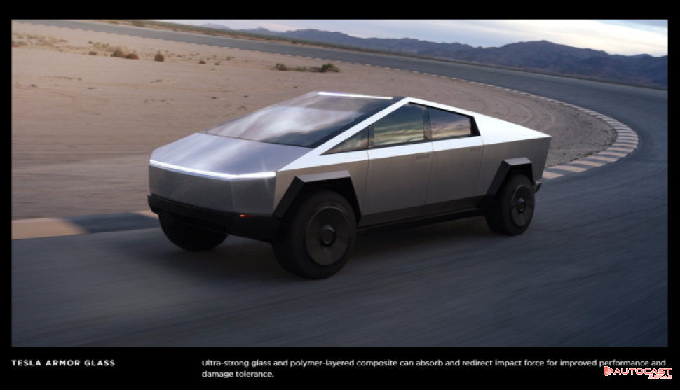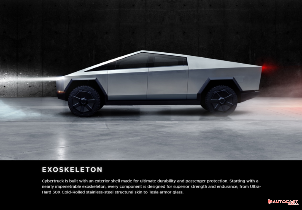 완전히 직선만 사용한 디자인을 갖춘 이 차는 강화유리와 차체를 갖췄다. 신차 출시 행사에서 앨론 머스크는 강철 공으로 차의 유리를 깨는 퍼포먼스를 보여주기도 했다. 강화 스테인레스 스틸을 사용한 차체는 외부의 충격이나 사고로부터 승객을 완벽하게 보호한다고 테슬라는 전했다.