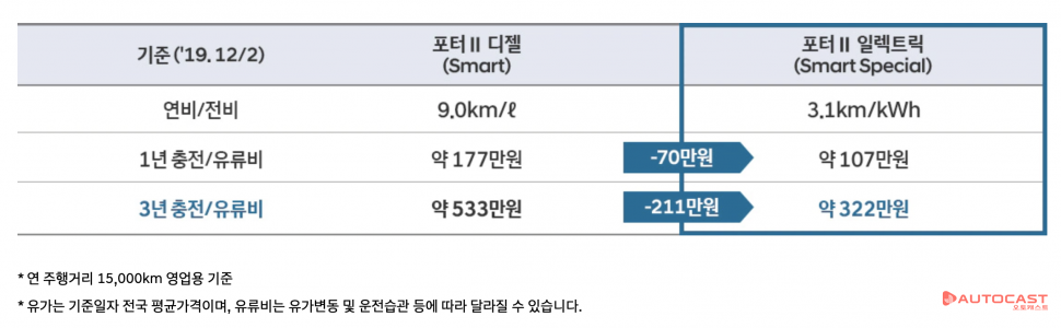 여기에 1년 1만5000km를 주행하는 경상용 트럭의 경우 1년 충전비가 약 107만원으로 동급 포터2 디젤 모델의 177만원에 비해 약 70만원 절감할 수 있으며 3년 운행하는 경우 디젤이 533만원인데 비해 포터2 일렉트릭은 322만원으로 약 211만원을 절감한다고 현대차는 밝혔다.