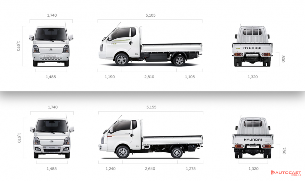 한편, 차체 크기는 기존의 포터2 디젤 모델과 상당부분 차이가 있다. 배터리와 모터를 탑재하면서 휠베이스가 기존의 2640mm에서 2810mm로 크게 늘어난 반면 앞, 뒤 오버행은 모두 줄었다. 전체 길이는 디젤의 5155mm에 비해 5105mm로 줄어 큰 차이가 없다. 나머지 폭, 높이 등은 동일하며 적재함 높이는 780mm에서 800mm로 높아졌다.