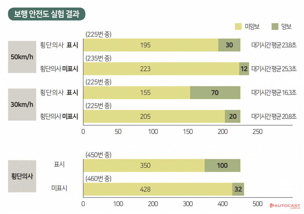 특히 신호가 없는 횡단보도에서 통행우선권에 대해서는 운전자의 인식과 운전습관에 괴리가 있는 것으로 나타났다. 운전자의 81.6%는 신호가 없는 횡단보도에서 멈추고 양보하겠다고 답했다. 하지만 실제 신호가 없는 횡단보도에서 의사를 표시하고 450회 횡단을 시도했을 때 운전자가 정차한 경우는 22.2%(100회)에 불과했다. 의사를 표시하지 않을 경우에는 460번 중 32회만 운전자가 정차했다.