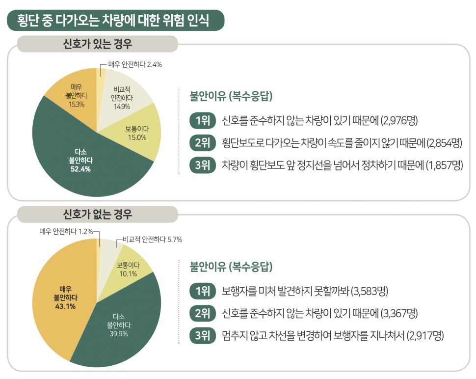 신호가 없는 횡단보도를 횡단하는 경우 응답자의 83.1%(6326명)가 불안함을 느꼈다. 운전자의 전방주시태만과 신호 미 준수, 멈추지 않고 빠른 속도로 접근 등을 불안감의 원인인 것으로 나타났다. 상황별로 구분하면 보행자는 보・차도 구분없는 도로 보행(43.2%), 신호기 없는 횡단보도 횡단 시(28.2%), 교차로에서 우회전 차량 접근(22.8%) 순으로 불안함을 느낀다고 답했다.