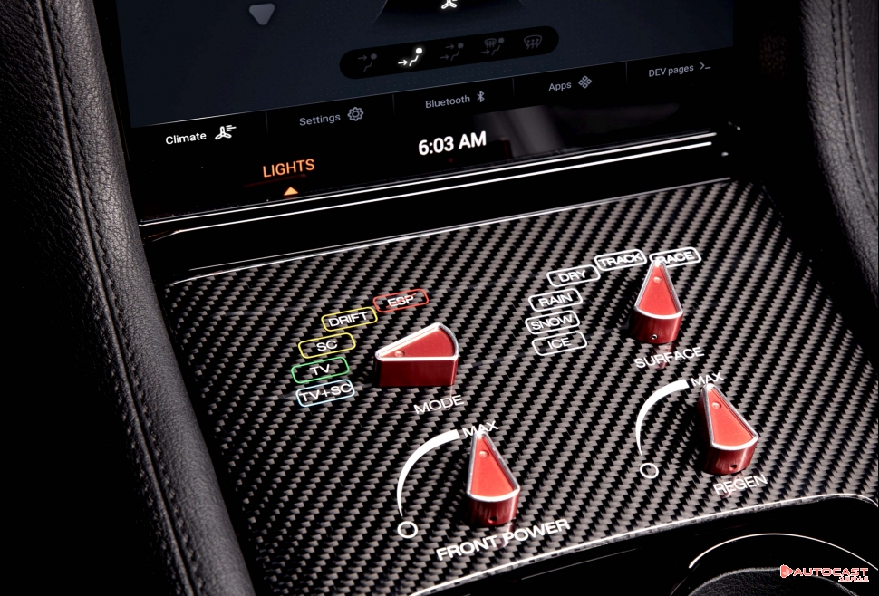 섀시는 피스커 카르마와 공유하며, 서스펜션은 올린즈(Ohlins) 사의 조절형 서스펜션을 장착한다. 브레이크는 브렘보 사의 카본 세라믹 디스크 브레이크를 달았다. 운전자는 센터콘솔에 위치한 다이얼을 이용해 드라이브 모드, 노면 상태에 따른 설정, 회생 제동량 등을 조정할 수 있다.