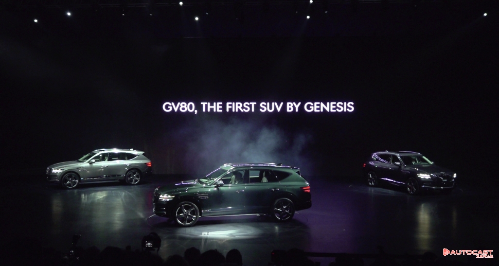 15일 GV80의 신차 발표에서 루크 동커볼케 디자인 담당 부사장은 제네시스의 엠블럼을 차체의 앞면에 형상화한 크레스트 그릴과 쿼드 램프에 대해 설명했다. 동시에 행사장 뒤엔 검게 처리된 배경에 상징적인 쿼드 램프의 주간주행등이 켜져 있는 6대의 각기 다른 제네시스 모델이 등장했다.