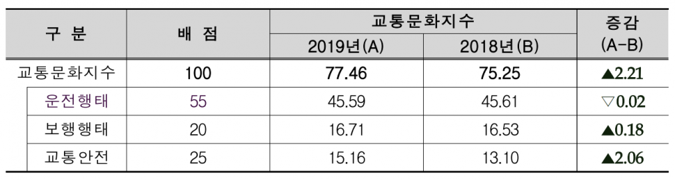 국토교통부는 ‘2019 교통문화지수 실태조사’ 결과를 31일 발표했다. 조사 결과 77.46점으로 전년(75.25점) 대비 2.21점 상승했으나 운전·보행 중 스마트기기 사용빈도나 규정 속도위반 빈도, 뒷좌석 안전띠 미착용률 등은 여전히 높은 것으로 나타났다.