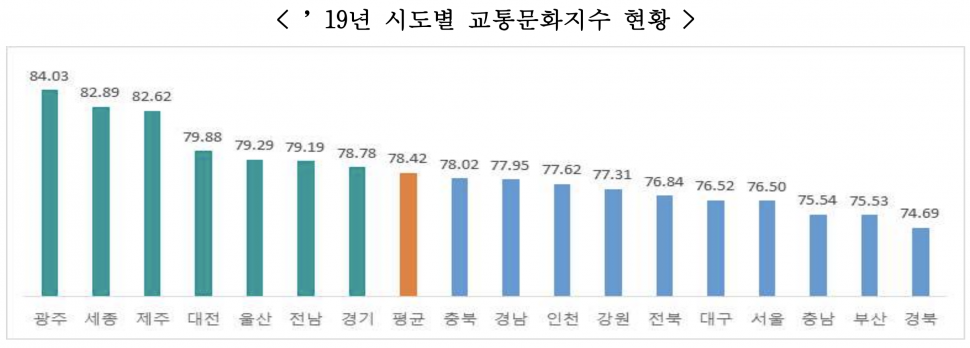 시·도별로는 광주광역시가 1위(84.03점), 세종특별자치시, 제주특별자치도 순으로 교통문화지수가 상위로 나타났다. 충청남도, 부산광역시, 경상북도가 하위 지자체로 조사됐다. 울산광역시(79.29점)는 전년대비 순위가 가장 많이 상승(17→5위)했다.