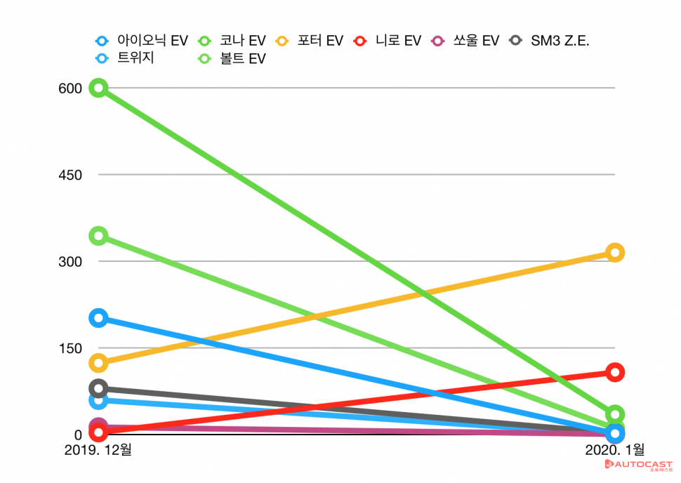 국산 자동차 회사가 2월 초 발표한 판매량 자료에 따르면 대부분의 전기승용차는 전월 대비 90% 이상 감소해 한 자릿수 내외를 기록했다. 반면, 현대자동차의 포터 EV는 총 315대를 판매했다.