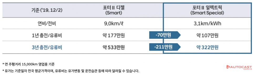 포터 EV의 높은 경제성도 판매에 긍정적인 영향을 미쳤다. 포터2 일렉트릭은 58.8kWh의 배터리를 탑재해 완전 충전 시 최대 211km를 주행할 수 있다. 이를 통해 연 주행거리 15000km 기준 충전비는 약 107만원으로 디젤 모델의 유류비 177만원에 비해 연간 약 70만원을 절약할 수 있다.