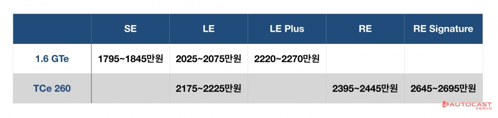 전 트림에 전자식 파킹 브레이크, 패들시프트, 전좌석 원터치 세이프티 파워 윈도우, LED PURE VISION 헤드램프가 기본으로 적용되며, 최상위 RE 시그니처 트림에는 EASY CONNECT 9.3인치 내비게이션, 10.25인치 디지털 클러스터, 오토홀드 기능이 기본으로 적용된다.