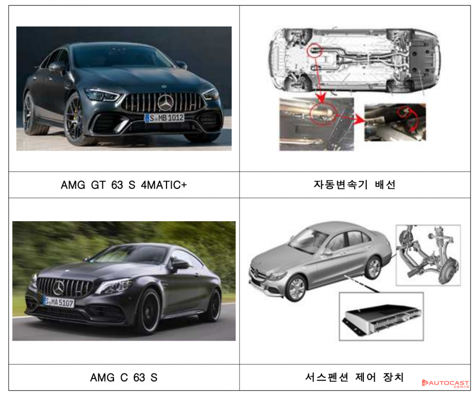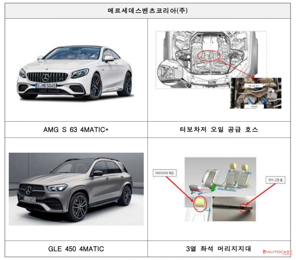아직 판매되지 않은 GLE 400 d 4MATIC 등 2개 차종 4대는 3열 좌석 머리지지대의 조정과 고정이 제대로 되지 않아 탑승자에게 상해를 입힐 가능성이 나타났다. 아울러 AMG GT 63 4MATIC+ 등 2개 차종 2대는 자동변속기 배선을 고정하는 클립의 장착 위치 불량으로 변속기가 작동되지 않을 가능성이 나타나 리콜 대상에 포함됐다.