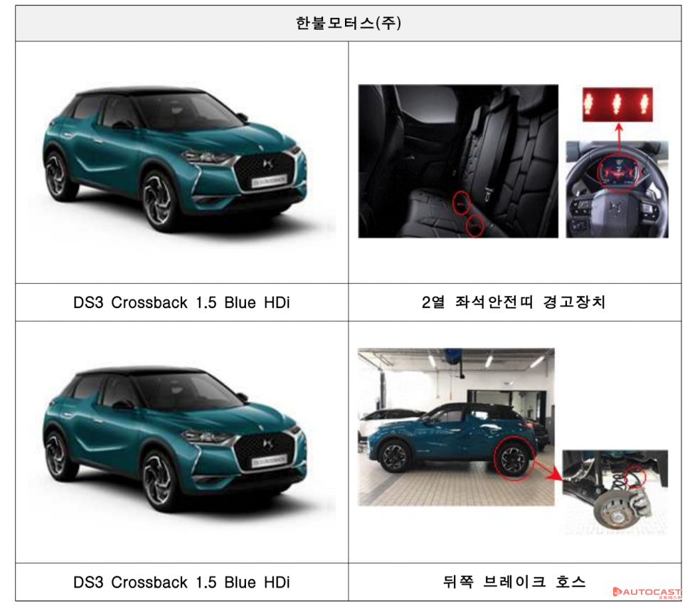 이 밖에 DS3 Crossback 1.5 Blue HDi 7대는 뒤쪽 브레이크 호스의 고정 불량으로 안전운행에 지장을 줄 가능성이 확인됐다. DS3 Crossback 1.5 Blue HDi 29대(미판매)는 상·하 부품이 제대로 접착되지 않은 냉각수 저장탱크가 장착돼 엔진이 과열될 가능성이 발견돼 리콜에 들어간다. 해당 차량은 오는 3일부터 무상 수리를 진행할 예정이다.