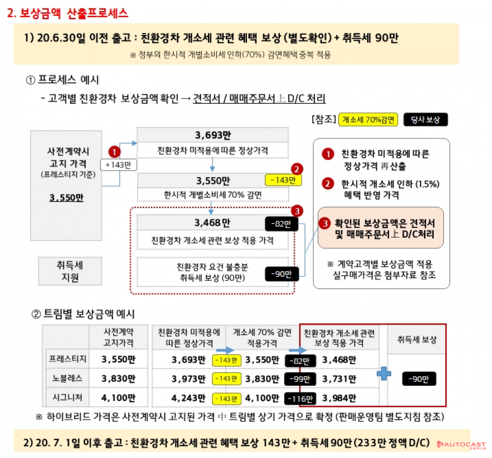 이에 신형 쏘렌토 하이브리드 사전계약 고객들은 계약시 고지된 가격 그대로 차량을 구매할 수 있다. 여기에 6월 이전까지 차량을 출고받는 고객은 한시적으로 인하된 개별소비세를 동시에 적용 받는다. 개별소비세 인하 기간이 끝나는 7월 1일 이후에 출고 받는 고객에게는 친환경차 관련 혜택 보상 143만원에 취득세 보상 90만원을 보상한다. 취득세 비용은 차량 가격에서 할인하는 방식으로 제공한다.