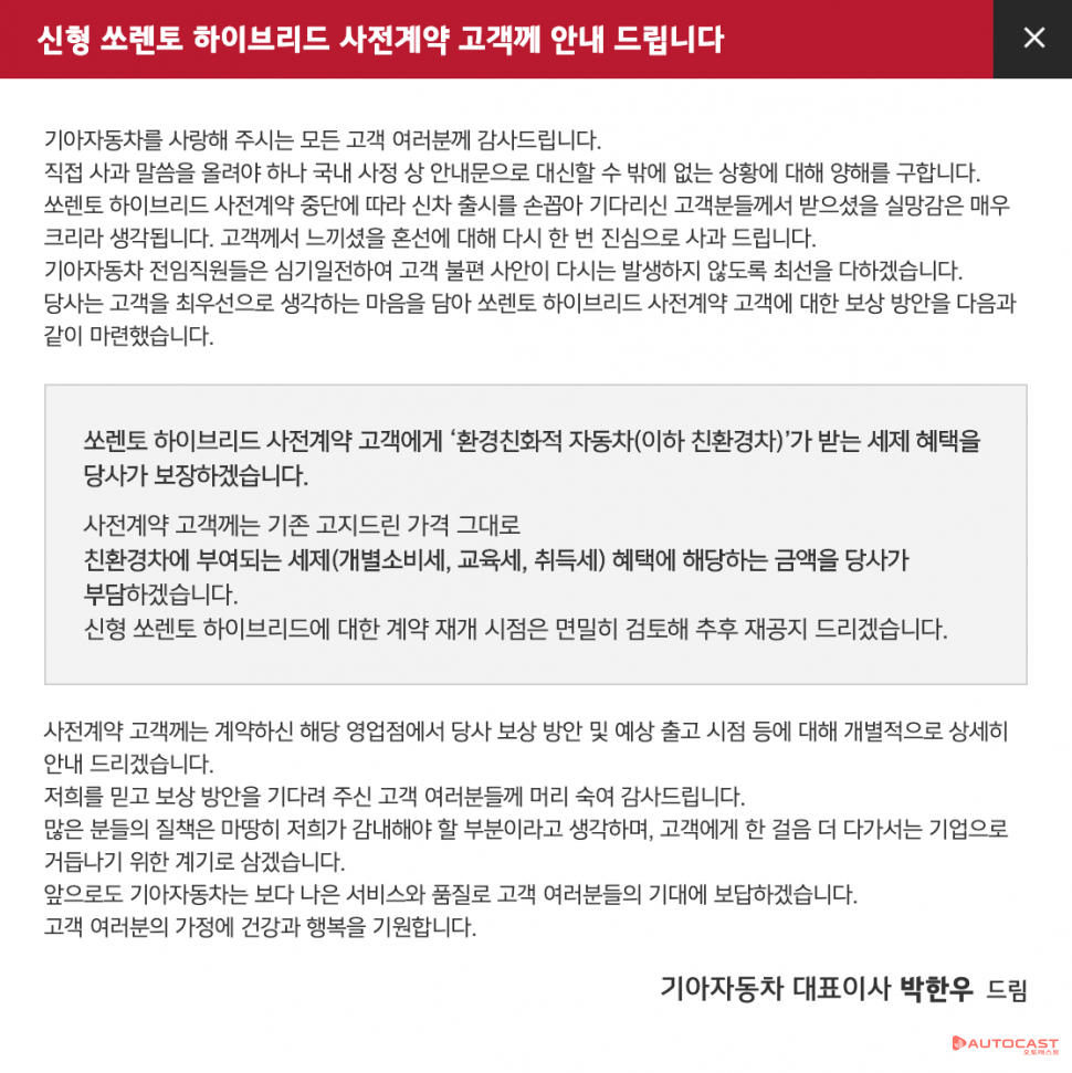 6일 기아차는 쏘렌토 하이브리드 사전계약 고객 대상 보상방안 안내문을 통해 “쏘렌토 하이브리드 사전계약 고객에게 계약 당시 고지한 가격 그대로 친환경차에 부여되는 세제(개별소비세, 교육세, 취득세) 혜택에 해당하는 금액을 당사가 부담할 것”이라고 밝혔다.