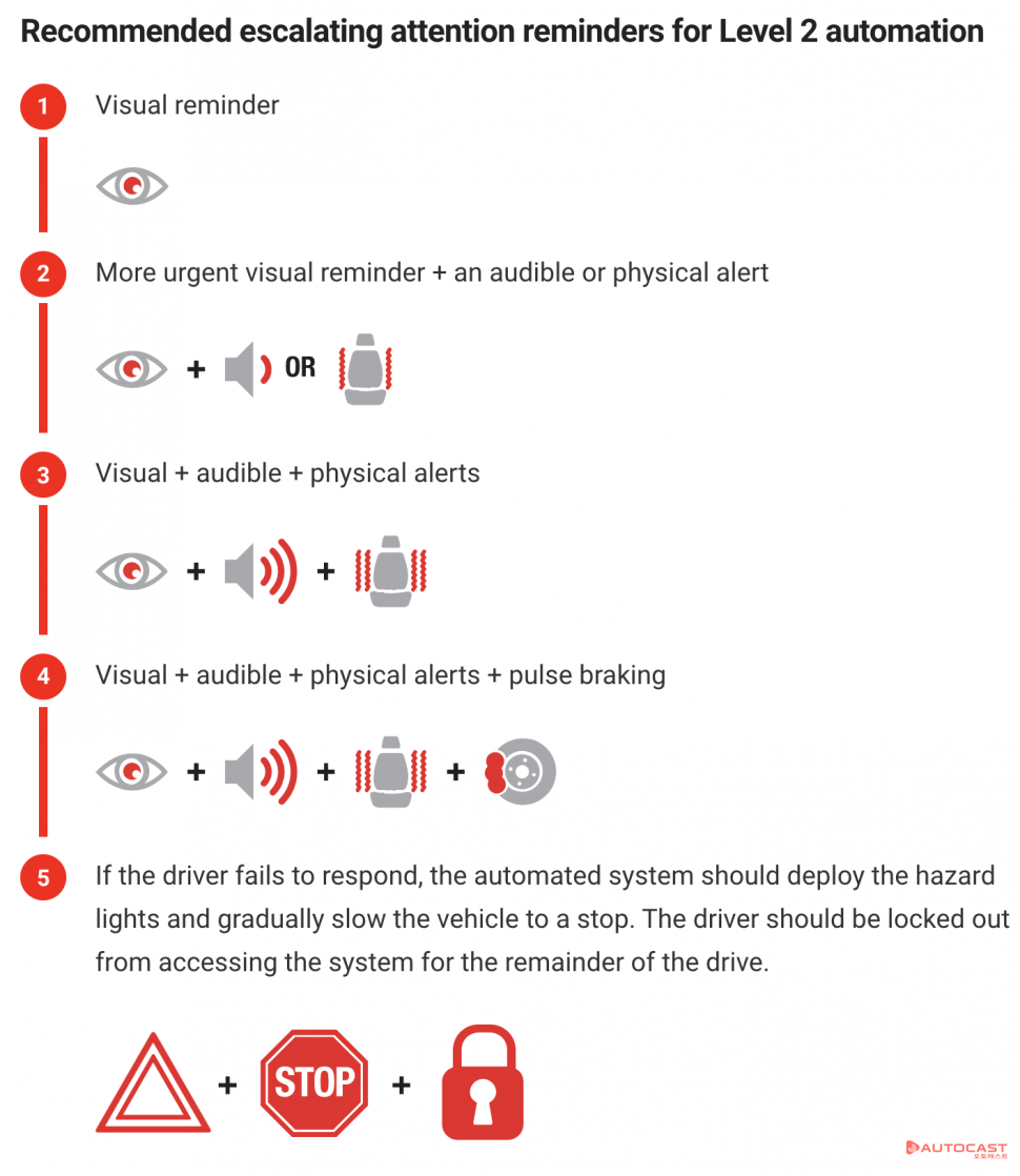 이에 IIHS는 이번 권고안을 통해 운전자의 시선과 머리 방향, 핸들 접촉, 차선 이탈 빈도 등 운전자 이탈을 직간접적으로 모니터링하고 감지할 수 있는 장치의 필요성을 주장했다. 또 주행 조건이 안전하지 않은 경우나 도로상에서 자율주행 모드 사용을 억제할 수 있는 장치의 필요성도 언급했다.