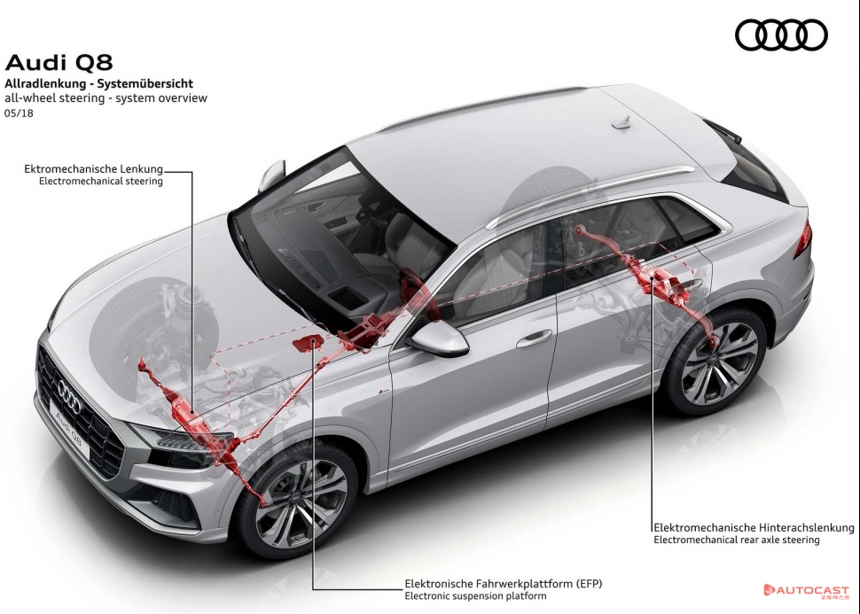 신형 Q8에는 아우디의 사륜 조향 시스템인 ‘다이내믹 올 휠 스티어링(Dynamic all-wheel steering)‘을 적용해 최적의 핸들링 성능도 갖췄다. 동시에 혁신적인 차체 경량 구조 기술을 통해 차량의 전체 중량은 감소하면서도 우수한 강성을 확보해 뛰어난 주행 안전성과 연비 향상에 기여한다.