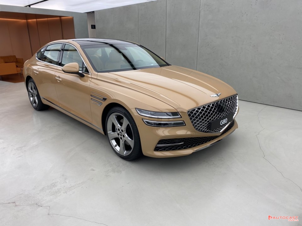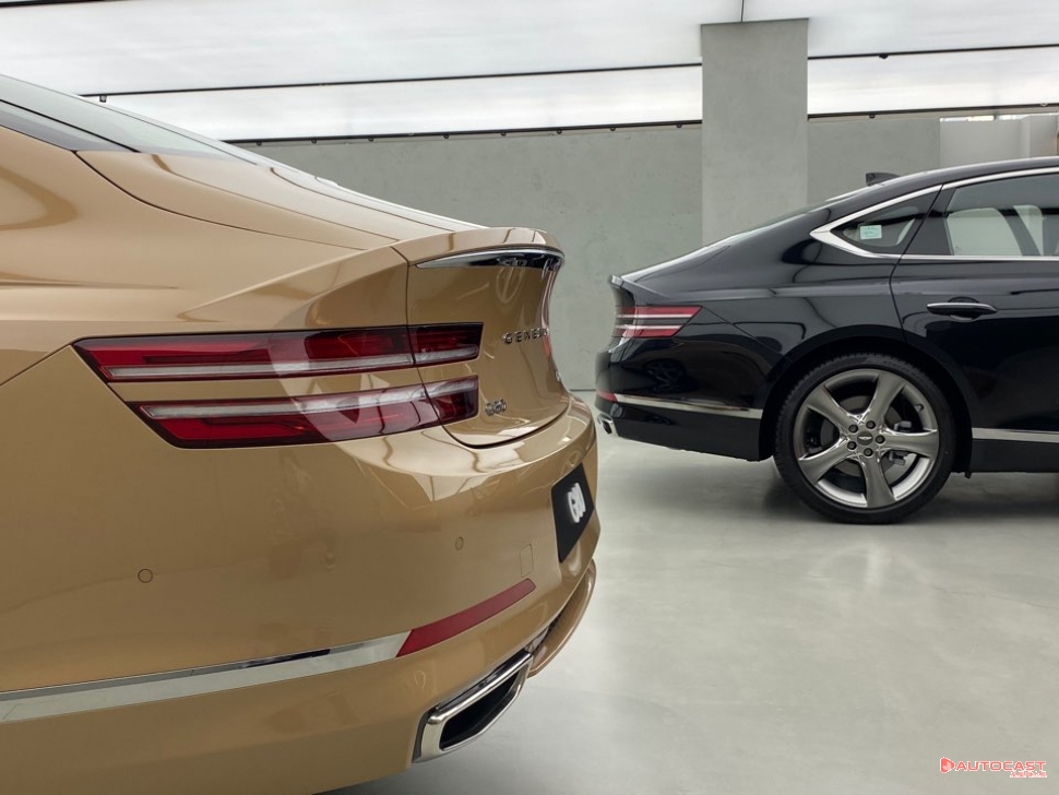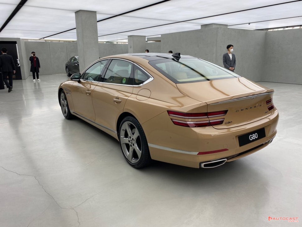 디자인은 제네시스 SUV GV80와 마찬가지로 대형 크레스트 그릴과 두 줄 디자인의 쿼드램프를 적용했다. 또 쿠페와 같이 매끄럽게 떨어지는 루프라인을 적용하고 전면부 쿼드램프에서 도어 상단부를 거쳐 후면부로 갈수록 점점 낮게 이어지는 ‘파라볼릭 라인(Parabolic Line)’을 적용했다. 후면부 역시 쿼드램프를 적용하고, 트렁크 표면은 말굽 형태로 둥글게 음각 처리했다.