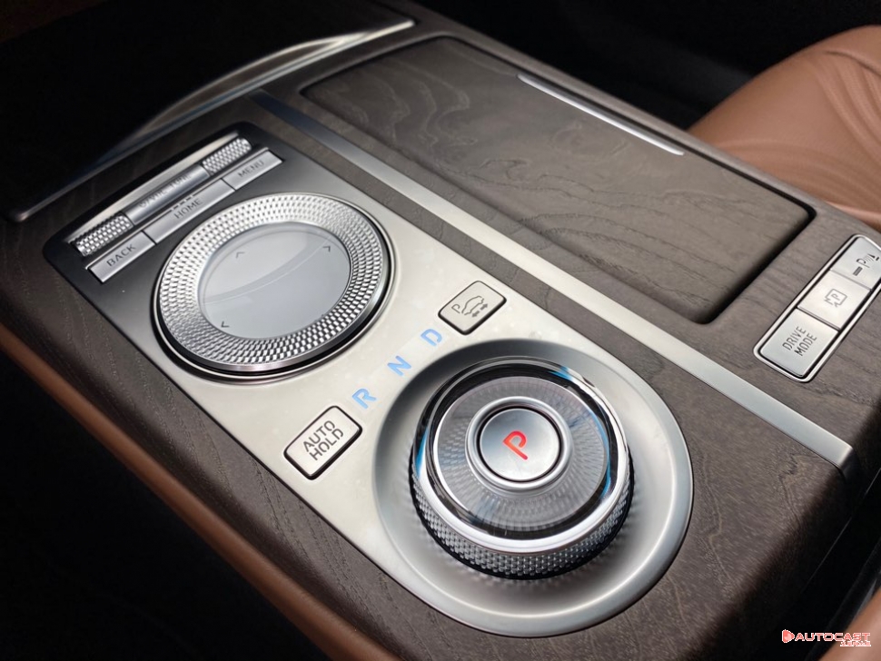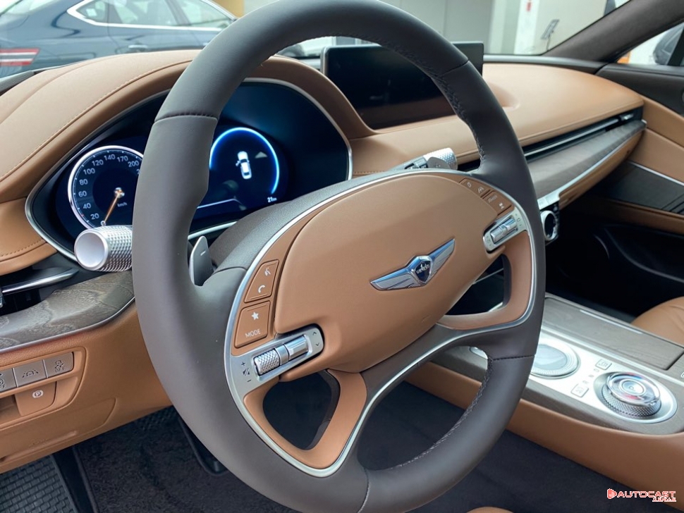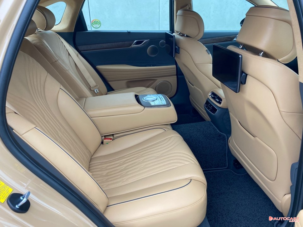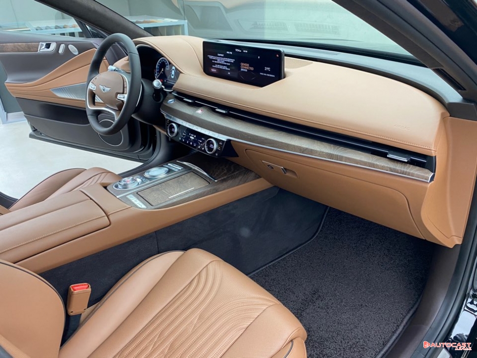 실내 크래쉬패드(계기판, 수납구 등이 포함된 부분)에는 양쪽 문과 접하는 부분까지 길게 이어진 날렵한 형태의 송풍구를 적용했다. 또 가로로 넓은 14.5인치 디스플레이를 배치했다. 센터콘솔에는 회전 조작 방식의 원형 전자식 변속기와 터치 및 필기 방식으로 인포테인먼트 시스템을 조작할 수 있는 제네시스 통합 컨트롤러(필기인식 조작계)를 적용했다.