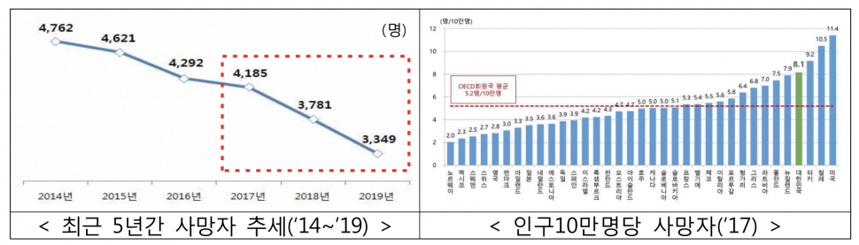 하지만 OECD 국가와 비교하면 여전히 미흡한 수준이다. 지난 2017년 인구 10만 명당 사망자 수는 OECD 35개국 중 32위로 하위권을 기록했다. 2019년에는 순위가 소폭 올랐지만 28위로 교통사고 사망자수는 여전히 높은 편인 것으로 나타났다.