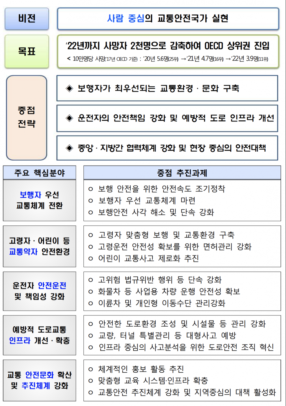 이에 정부는 교통사고 사망자 줄이기 대책을 발표했다. 먼저 도심부 속도 하향(60→50km/h) 정착 등 보행자 우선 교통체계로 전환한다. 운전자가 도심부에서 저속 운행하도록 회전교차로, 지그재그형 도로 등 교통정온화 시설을 확산하고, 도시 외곽 도로변에는 마을주민 보호구간을 보다 확대해 나갈 예정이다.