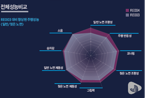 또한 그루브의 강성을 높여 마른 노면과 젖은 노면에서의 코너링과 제동력을 동시에 향상시켰다. 타이어 안쪽으로 넓어진 그루브 디자인으로 핸들 움직임에 따른 조향 반응이 더욱 빠르고 정확해졌으며, 도로면에 닿는 타이어 면을 균등하게 유지함으로써 보다 안정적인 주행과 정교한 컨트롤이 가능해졌다.