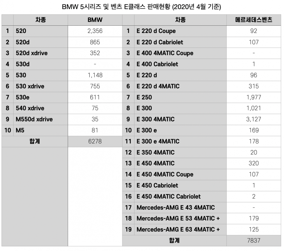 5시리즈와 E클래스 모두 변경 수준이 비슷한 데다가 출시일도 올 하반기로 예정돼 있어 두 모델의 경쟁은 더욱 치열해질 것으로 보인다. 과거 BMW는 벤츠와의 경쟁에서 1위를 이어오다 지난 2016년 처음으로 1위 자리를 내줬다. 이후 화재 이슈 등으로 판매 감소를 겪다가 최근 신차를 줄줄이 내놓으면서 격차를 대폭 줄였다. 반면 벤츠는 최근 배출가스 조작 논란이 변수로 작용하면서 두 모델의 경쟁 구도가 어떻게 흘러갈지 관심이 쏠리고 있다. 지난 한해 국내 시장에서 5시리즈와 E클래스는 각각 19,337대, 39,782대를 팔았다. 페이스리프트 출시를 앞둔 올해는 지난달 기준으로 각각 6278대, 7837대를 팔며 격차가 줄어든 상태다.