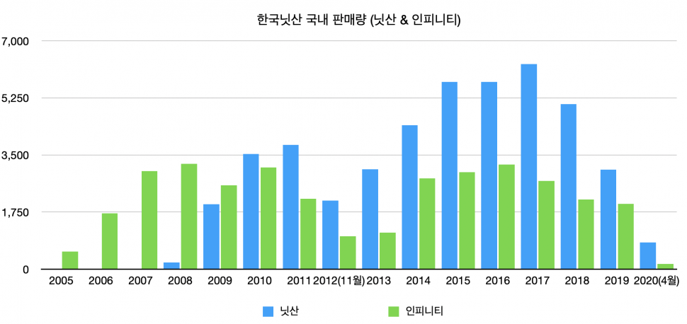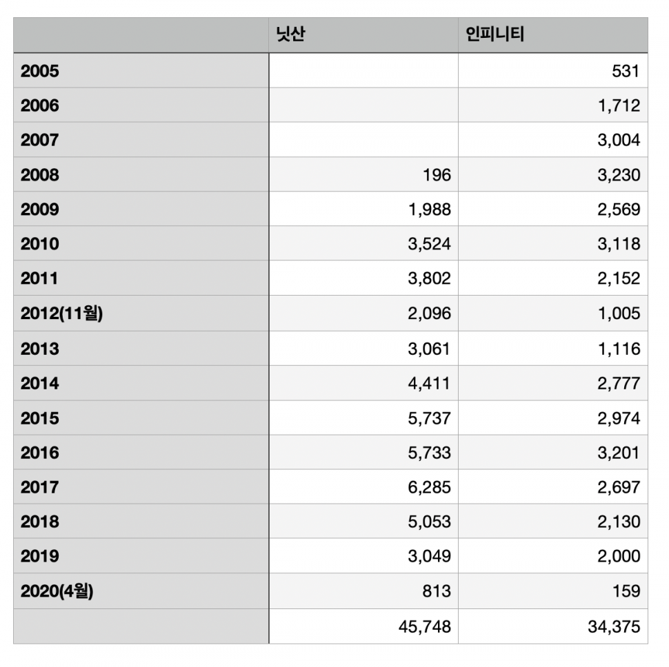인피니티는 한국 시장에서 지난 2005년 판매를 시작해 올해 4월까지 누적 3만4375대를 팔았고, 닛산은 2008년 판매를 시작해 누적 4만5748대를 기록했다.