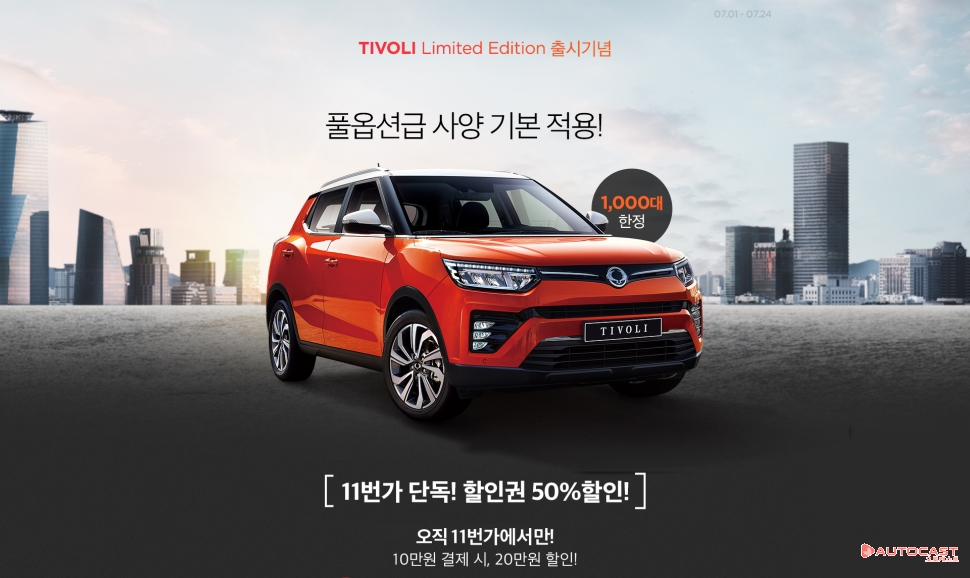 쌍용차에 따르면 티볼리 구매를 원하는 고객은 오는 24일까지 11번가에서 20만원 할인권을 반값인 10만원에 구매해 신차 계약 시 사용할 수 있다. 할인권을 구매하면 가까운 전시장과 연결돼 담당 영업사원과 시승 신청을 비롯한 구체적인 구매 상담이 진행된다.