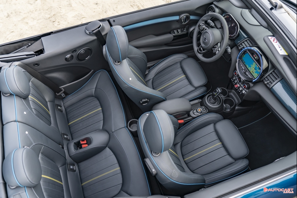 실내에는 사이드워크 에디션 전용 MINI 유어스 천연 가죽 시트, 대시보드 패널, 스티어링 휠 로고, 도어실 플레이트 등을 적용했다. 이와 함께 컴바이너 타입의 헤드업 디스플레이를 적용했다. 쿠퍼 S 모델의 경우 프리미엄 하만카돈 스피커를 추가했다.