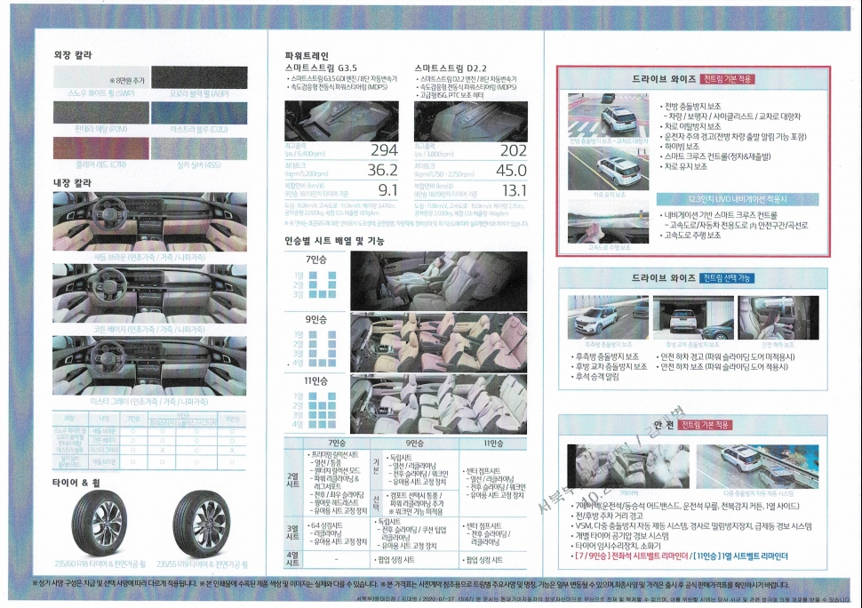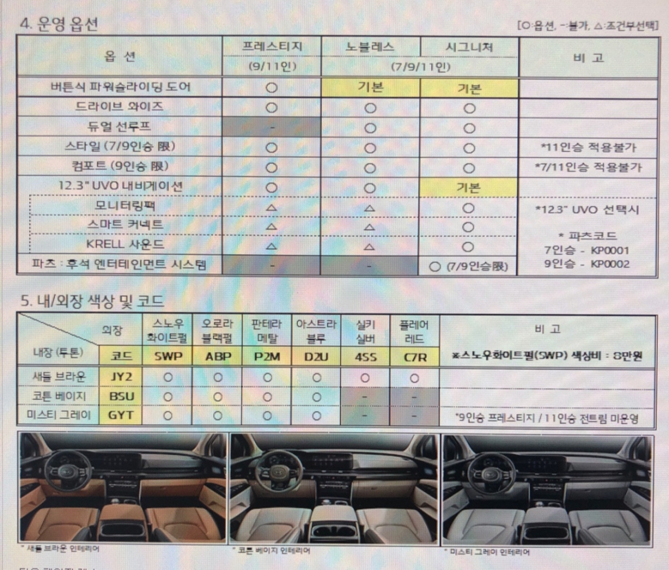 상위 트림인 시그니처는 가솔린 9인승 및 11인승 3985만원, 7인승 4236만원이다. 디젤은 9인승 및 11인승 4105만원, 7인승 4354만원이다. 12.3인치 계기판 및 디스플레이, 앰비언트 라이트 등이 추가된다. 아울러 내비게이션 기반 스마트 크루즈컨트롤, 고속도로 주행보조 등이 담긴 드라이브와이즈 일부와 기아 페이, 후석 음성인식 및 대화모드 등의 사양이 기본이다. 7인승은 19인치 컨티넨탈 타이어 및 휠과 나파가죽시트가 적용된다.