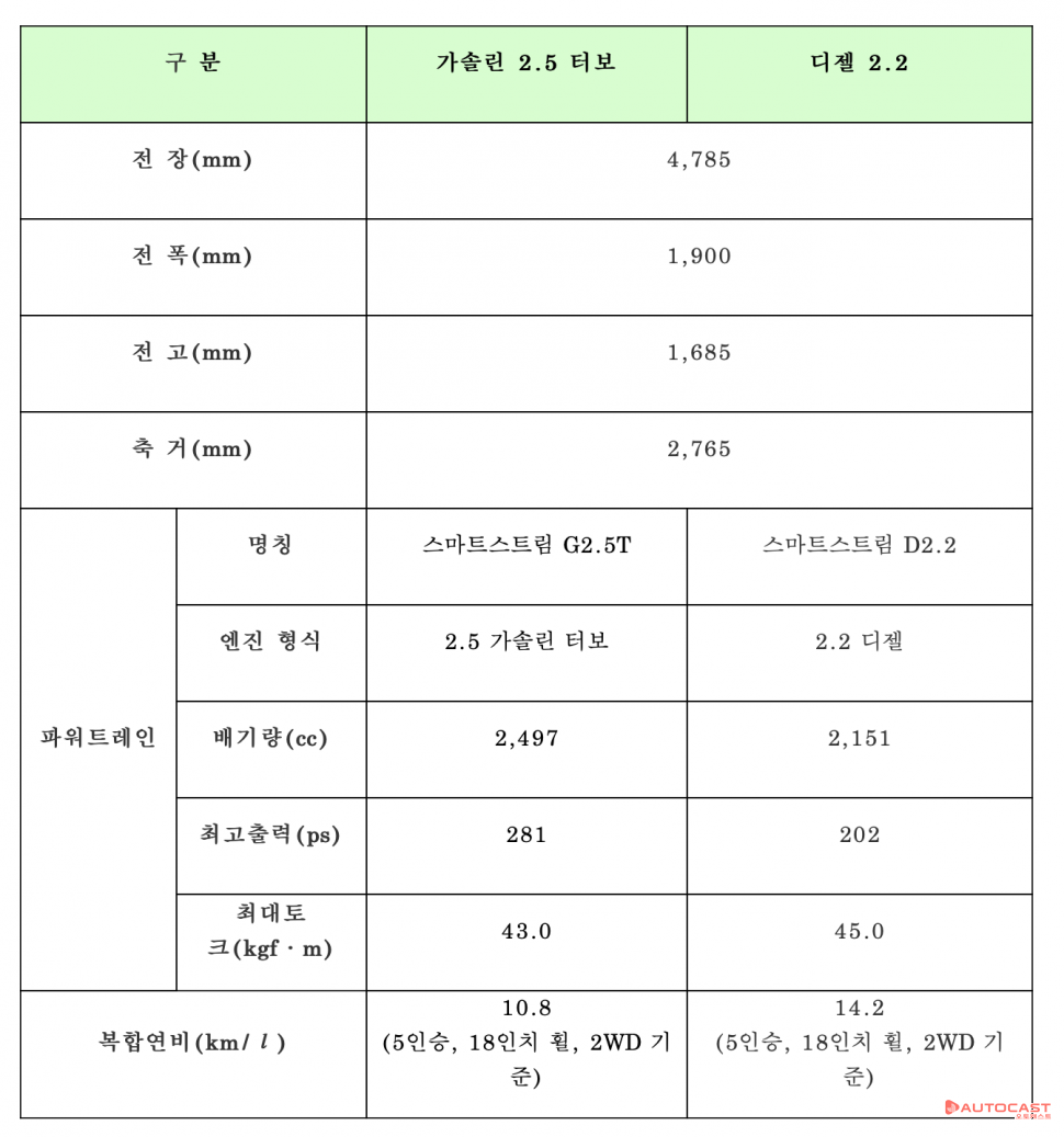 가솔린 터보 모델은 2.5리터 스마트스트림 엔진을 장착해 최고출력 281마력(ps)과 최대토크 43.0kgf.m의 출력을 내며 습식 8단 듀얼 클러치 변속기를 사용한다.
