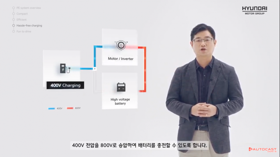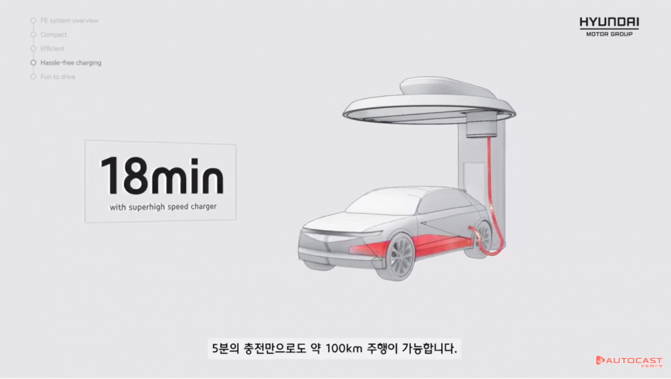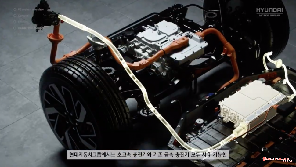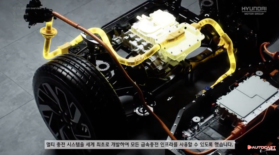 이 멀티 급속충전 시스템은 세계 최초로 E-GMP에 적용된 특허 기술이다. 차량의 구동용 모터와 인버터를 활용해 인프라에서 공급되는 400V 전압을 차량 시스템에 최적화된 800V로 승압해 안정적인 충전호환성을 확보할 수 있도록 개발했다.