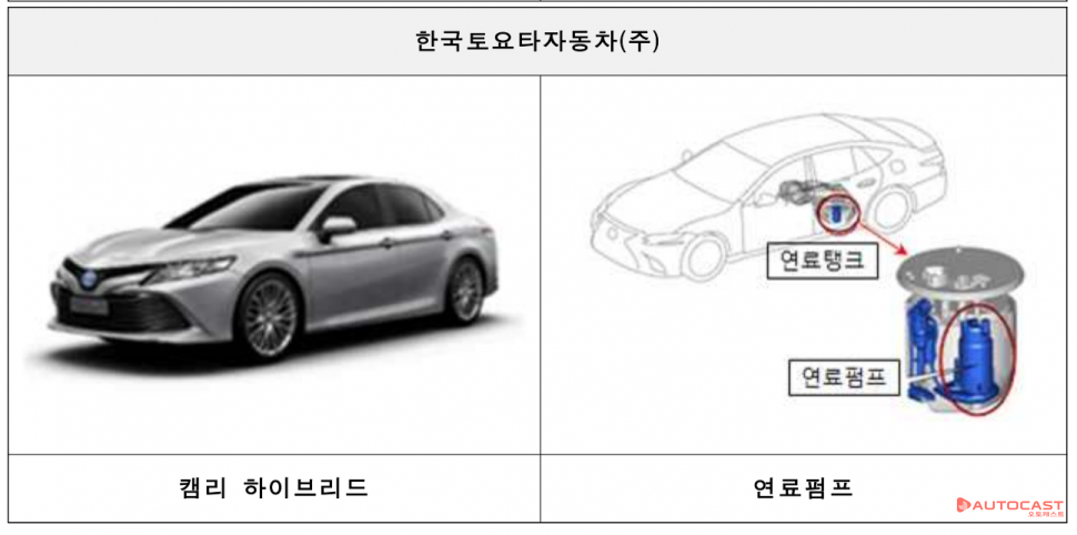 토요타 캠리 하이브리드 등 24개 차종 1만5024대는 연료펌프 내 일부 부품의 결함으로 연료펌프가 작동되지 않아 주행 중 시동이 꺼질 가능성이 발견됐다. 해당 차량은 12월 24일부터 한국토요타자동차공식서비스센터에서 무상으로 수리를 받을 수 있다.