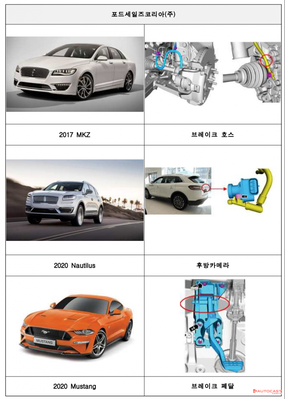 포드 MKZ 등 4개 차종 1만2172대는 앞바퀴 브레이크 호스의 내구성 부족으로 브레이크액이 누유돼 제동 시 제동거리가 길어질 가능성이 발견됐다. 머스탱 808대는 브레이크 페달 부품 내구성 부족으로 페달에 강한 힘을 전달 시 부품이 파손돼 제동력을 상실할 가능성이 확인됐다.