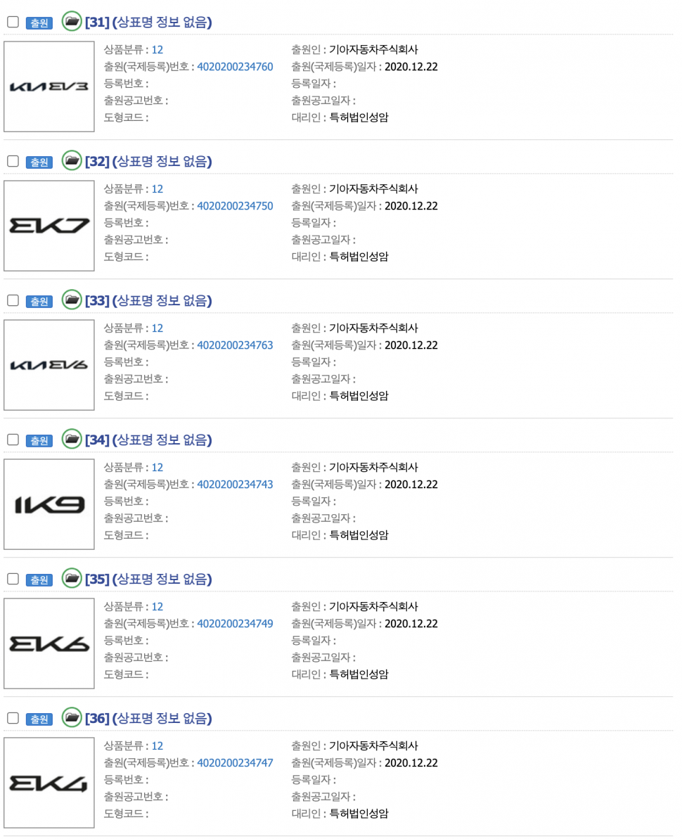 이에 기아차는 새로운 엠블럼의 특허 출원과 함께 전기차 관련 신규 상표건도 특허청에 잇따라 등록했다. 특허정보검색서비스 키프리스(kipris)에 따르면 기아차의 새 로고와 통일감을 준 ‘EV3’, ‘EK6’, ‘EK4’, ‘IK9’ 등이 등록돼 있다.