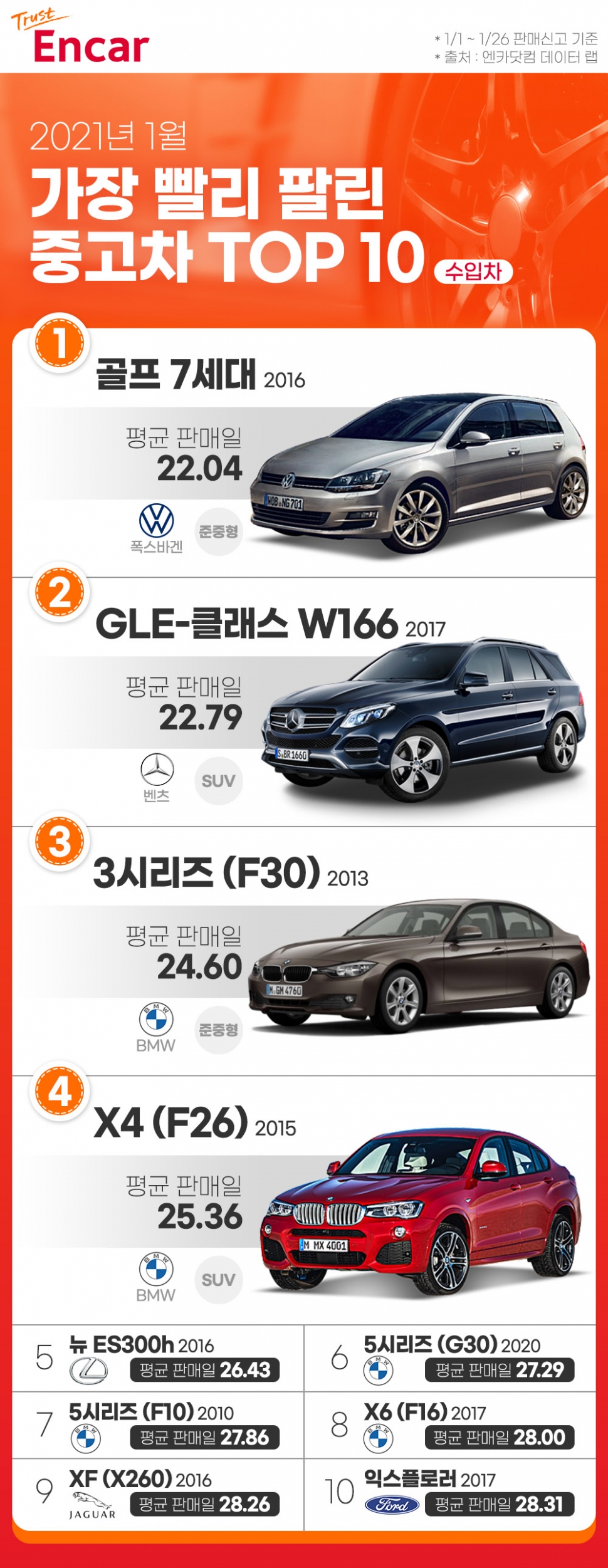 수입차의 경우 브랜드 대표 SUV 및 세단 모델들을 중심으로 국산차에 비해 최신 연식 모델 비중이 낮은 경향을 보였다. 수입차는 브랜드 대표 아이코닉 모델인 폭스바겐의 골프 7세대가 평균 판매일 22.04일로 가장 빨리 팔렸다. 메르세데스-벤츠 GLE 클래스(W166)가 22.79일로 2위를, BMW 3시리즈(F30)이 24.6일로 3위를 기록했다. 이어 BMW X4(F26)이 25.36일, 렉서스 뉴 ES300h가 26.43일로 각각 4위, 5위를 차지했다.