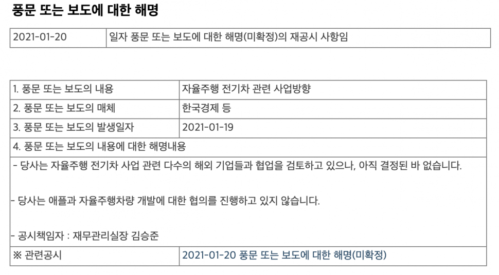 8일 현대・기아차는 각각 공시를 통해 “당사는 다수의 기업으로부터 자율주행 전기차 관련 공동개발 협력 요청을 받고 있으나 초기 단계로 결정된 바 없습니다”라고 밝혔다. 특히 “당사는 애플과 자율주행차량 개발에 대한 협의를 진행하고 있지 않습니다”라고 설명했다.