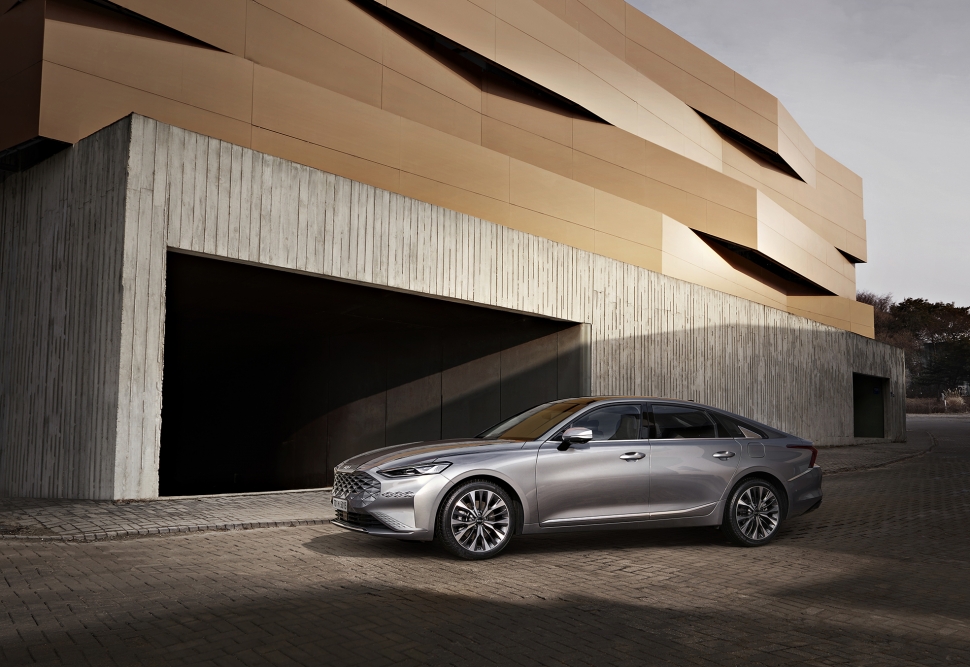 K8은 기아의 신규 디자인 정체성을 반영했다. 전면부에는 알루미늄 소재의 신규 엠블럼을 적용했다. 테두리가 없는(frameless)범퍼 일체형 라디에이터 그릴은 다이아몬드에서 영감을 받은 보석 같은 패턴을 따라 빛이 움직이는 모습을 구현했다. ‘스타 클라우드 라이팅(Star cloud Lighting)’은 라디에이터 그릴 양 옆에 위치해 주간주행등과 방향지시등의 기능을 하며, 라디에이터 그릴과 동일한 다이아몬드 패턴을 적용했다
