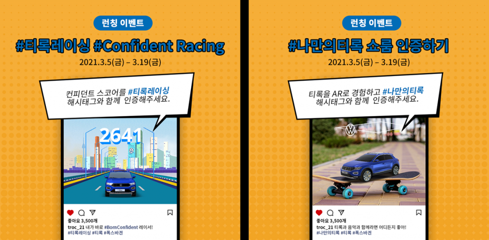 [오토캐스트=강명길기자] 폭스바겐코리아가 오는 19일까지 자사 공식 인스타그램 채널을 통해 ‘티록 레이싱’ 및 ‘나만의 티록’ 참여 이벤트를 진행한다고 8일 밝혔다. 이벤트를 통해 추첨 및 선정된 총 200명에게 15만원 상당의 경품을 증정한다.