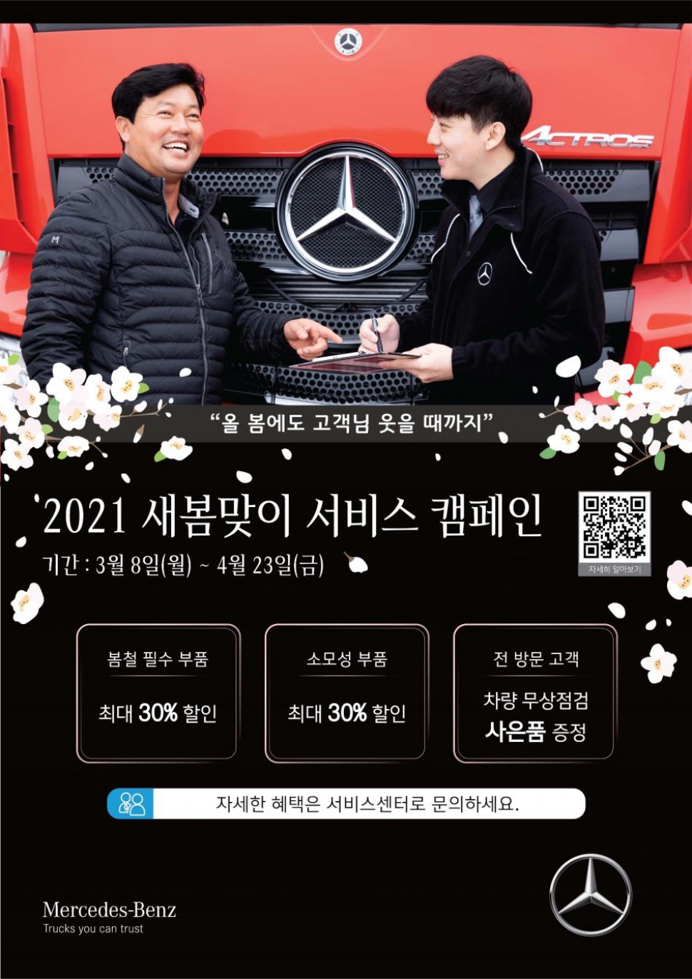 다임러 트럭 코리아 조규상 대표이사는 “메르세데스-벤츠 트럭은 폭설이 많았던 겨울을 지낸 차량에 꼭 필요한 정비를 통해 고객들의 안전 운행에 기여하는 것은 물론 실질적인 경제적 혜택을 체감할 수 있도록 부품을 엄선했다”며 “앞으로도 다임러 트럭 코리아는 총 보유 비용 절감을 넘어 총 운송 효율(TTE, Total Transport Efficiency)의 극대화를 위한 메르세데스-벤츠만의 혁신적인 효율 개념 ‘로드 이피션시(Road Efficiency)’가 적용된 차별화된 서비스를 지속적으로 개발, 제공해 나갈 계획”이라고 말했다.