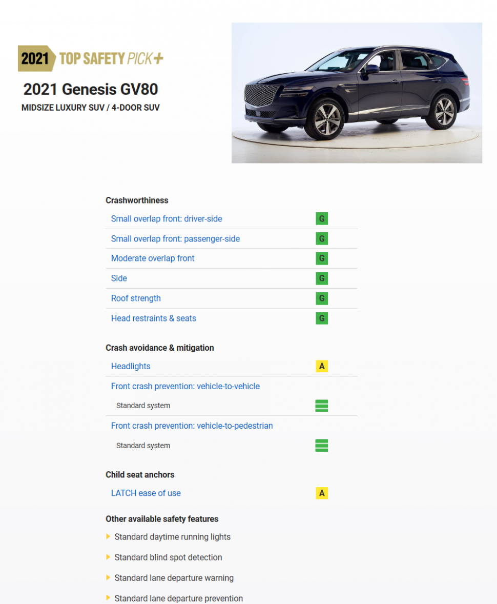또한 전방 충돌방지 시스템 테스트(차량과 차량/차량과 보행자)에서 상급(advanced)이상 등급을, 전조등 평가에서 양호(acceptable)이상 등급을 받아야 한다. GV80는 6개의 충돌 안전 항목 평가에서 최고등급인 우수(good)평가를 받았고, 전방 충돌방지 시스템에서는 최우수(Superior)등급을 받았다.
